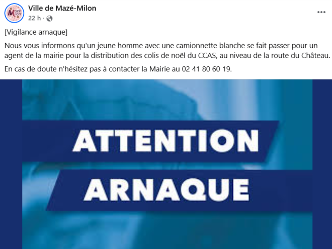 “Nous vous informons qu’un jeune homme avec une camionnette blanche se fait passer pour un agent de la mairie pour la distribution des colis de Noël du CCAS (Centre communal d’action sociale), au niveau de la route du Château”, indique la mairie sur Facebook.