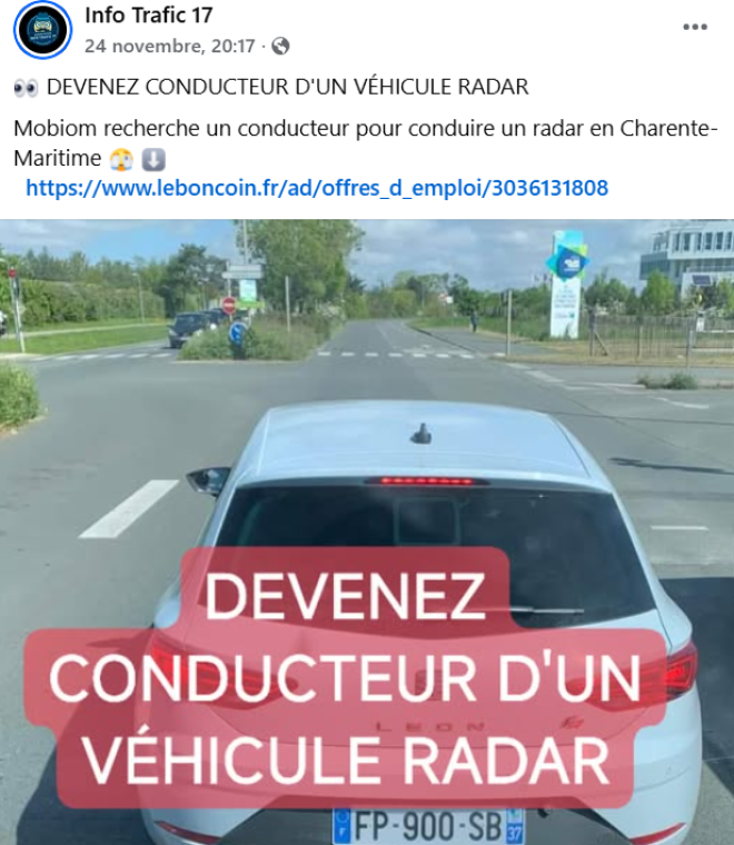 Sur Leboncoin, une offre d’emploi pas comme les autres a été publiée il y a deux jours par l’entreprise MOBIOM. Selon Charente-Libre, cette offre propose un CDI à 25 000 euros par an pour conduire une voiture banalisée, équipée d’un radar, sur la route. L’objectif de ces voitures est de flasher les automobilistes qui font des excès de vitesse, sans les avertir. S'il existe des façons de les repérer, ces voitures passent généralement inaperçues et sont des pièges pour les conducteurs.