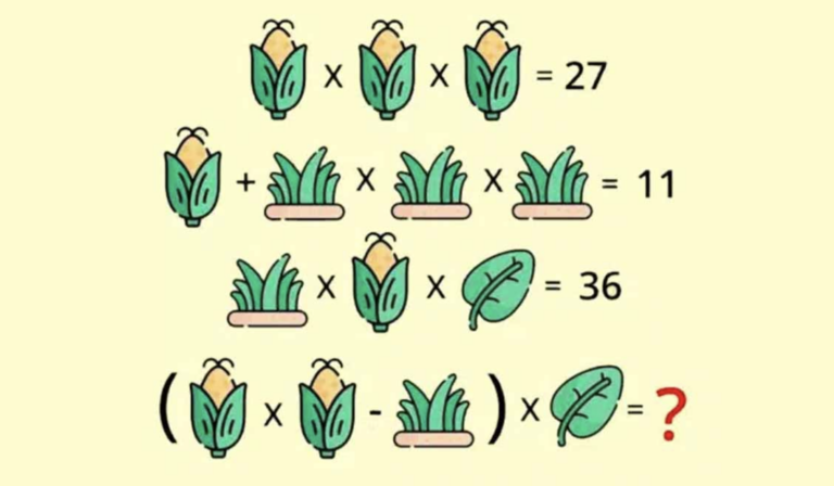 Procédons par étapes avec d'abord la première ligne : si un épi de maïs multiplié par un autre épi, que l'on multiplie encore par un troisième donne 27, alors un épi est égal à 3 puisque 3 x 3 x 3 = 27. Ensuite sur la deuxième ligne : si un épi additionné à un brin d'herbe, que l'on multiplie ensuite par deux autres brins donne 11, alors un brin équivaut à 2 puisque 3 + 2 x 2 x 2 = 11. Enfin sur la troisième ligne : si un brin multiplié par un épi puis multiplié par une feuille donne 36, alors une feuille correspond au chiffre 6 puisque 2 x 3 x 6 : 36.