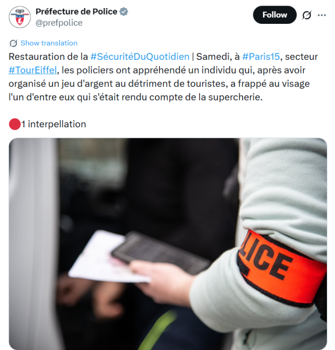 À Paris, au Trocadéro, un touriste a été interpellé par des escrocs pour jouer au bonneteau. S’apercevant de l’escroquerie après quelques parties, il a réagi mais s’est fait frapper par l’un des joueurs.