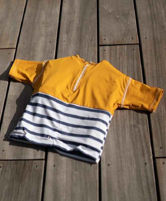 Derrière son aspect de marinière, ce t-shirt pas comme les autres cache un système intelligent capable de se gonfler rapidement au contact de l’eau. Ce qui ne semblait être qu’un t-shirt pour la plage se transforme en une bouée de sauvetage.
