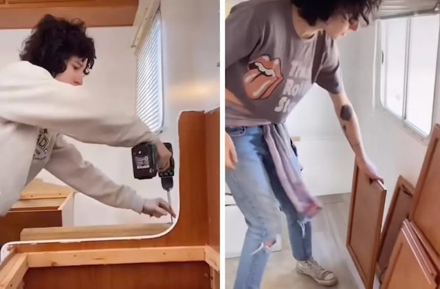 Au cours de cette période, Casey et Brandon ont posé un revêtement de sol stratifié avant de repeindre les armoires et la façade de la caravane. Mais ce n’est pas tout ! Les bricoleurs ont également construit leur propre mobilier.