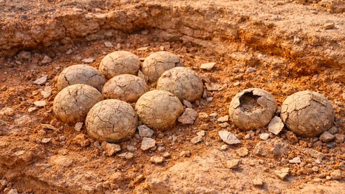 Ronds et craquelés, les oeufs mesurent la taille d'un ballon de foot et 98% d’entre eux sont déjà éclos mais quelques-uns sont encore entiers. Cette accumulation pourrait être l'œuvre d'un troupeau de tétanosaures, bien qu'aucun embryon n'ait été retrouvé à l'intérieur de ces œufs fossiles. Ces sauropodes quadrupèdes pouvaient atteindre 12 mètres de long.