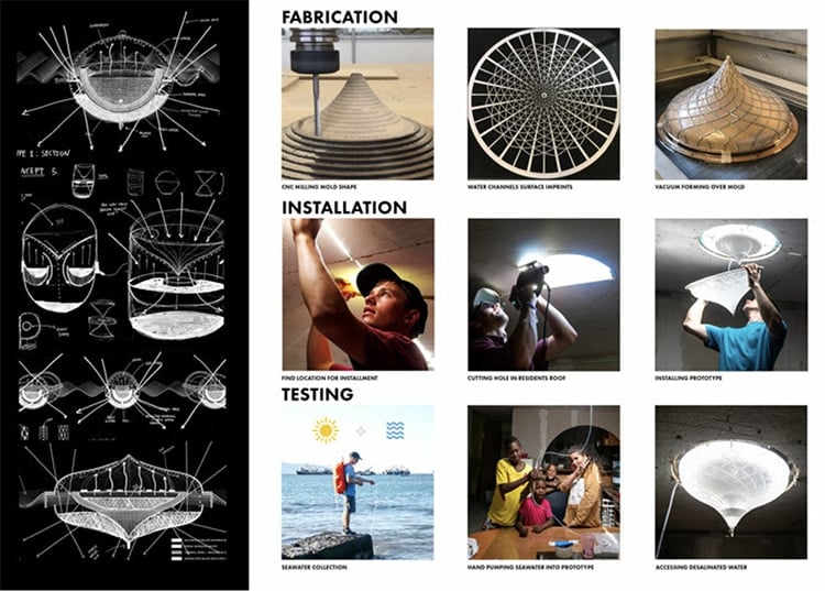 Le Solar Desalination Skylight est une lucarne éclairée par des ampoules LED. Elle a été installée pour la première fois dans une communauté côtière de Mejillones, au Chili, connue sous le nom de « Nueva Esperanza ».