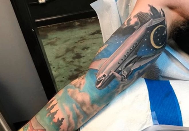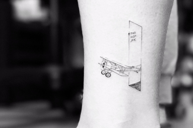 Un avion qui vole et ajoute un peu de mouvement... Un tatouage inspiré et inspirant, réalisé par le tatoueur Guy Shoval, à Tel-Aviv, Israël.