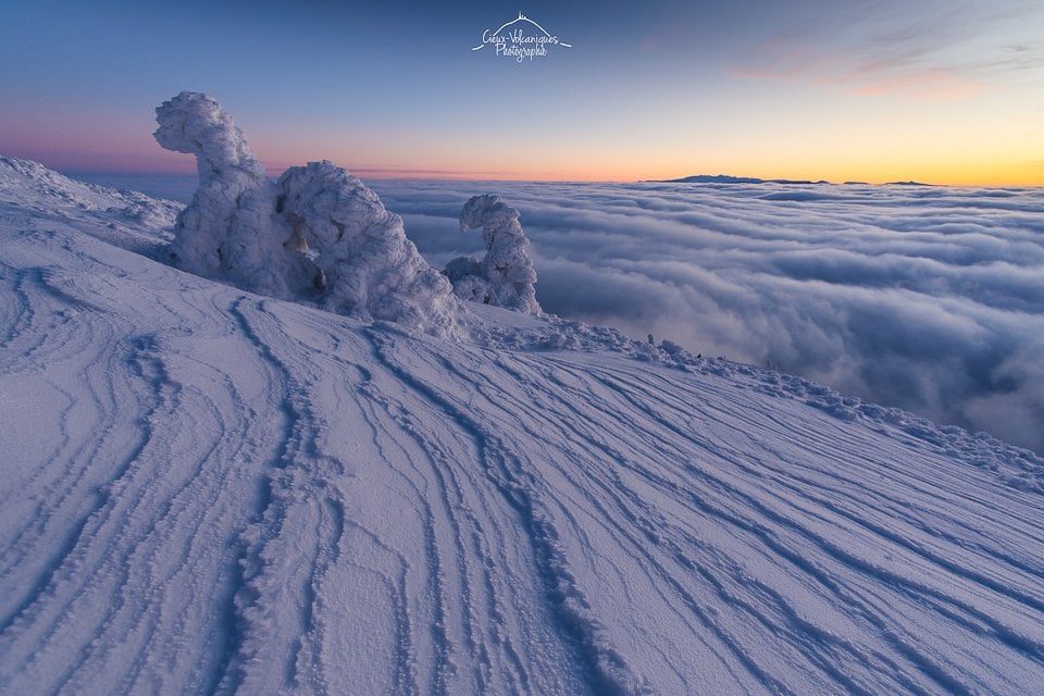 Ambiance onirique ce soir sur les pentes du Puy de Dôme. Un temps plus calme aujourd'hui, après les quelques jours de gros temps. Avec en prime une mer de nuages, et la nature pétrifiée.