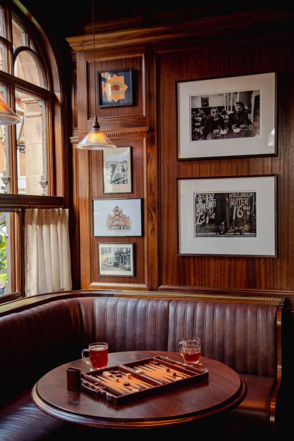 L'espace principal du rez-de-chaussée restera, sur le plan fonctionnel, ce qu'il a toujours été : un pub londonien classique, mais avec une touche artistique moderne. Les intérieurs en bois sombre, le bar en acajou massif, les cabines en cuir marron et la moquette traditionnelle à motifs rappellent l'histoire du bâtiment, tandis que des éléments restaurés sont disséminés dans toute la pièce, du couteau à découper du XIXe siècle utilisé lors de l'ouverture du pub, encadré sur le mur, à la cheminée d'origine, en passant par l'horloge du plafond du XIXe siècle, qu'une équipe de six polisseurs français a mis huit semaines à faire revivre.