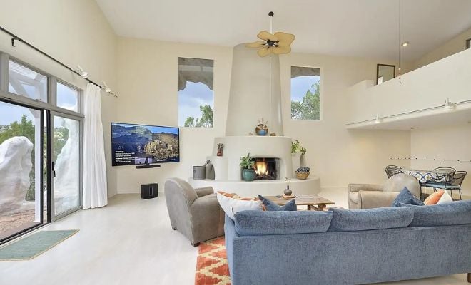 Construite en 1989, par la célèbre bijoutière Nora Pierson, décédée aujourd’hui, la propriété connue sous le nom de Casa de Roca est très insolite. Située sur un flanc de falaise à Santa Fe dans le Nouveau Mexique, cette maison se confond totalement avec la roche blanche de la falaise.